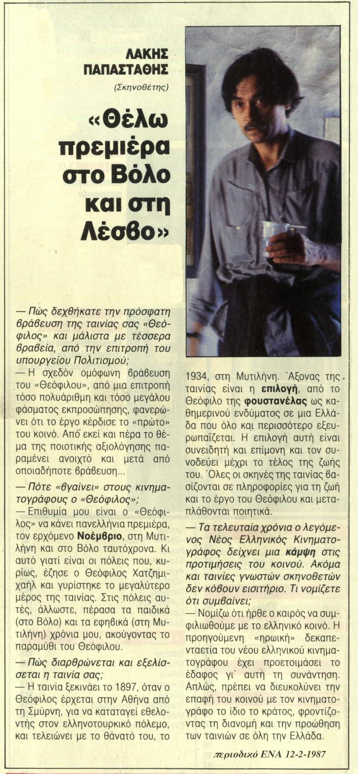 περισσότερα...Την Πέμπτη 18 Δεκεμβρίου στις 19:00 ο Λάκης Παπαστάθης παρουσιάζει το νέο του βιβλίο, Ο δάσκαλος αγαπούσε το βωβό σινεμά, στο Θέατρο Οδού Κυκλάδων, στην Κυψέλη. Το βιβλίο κυκλοφορεί από τις εκδόσεις Πόλις. Με τον συγγραφέα θα συζητήσουν οι σκηνοθέτε...