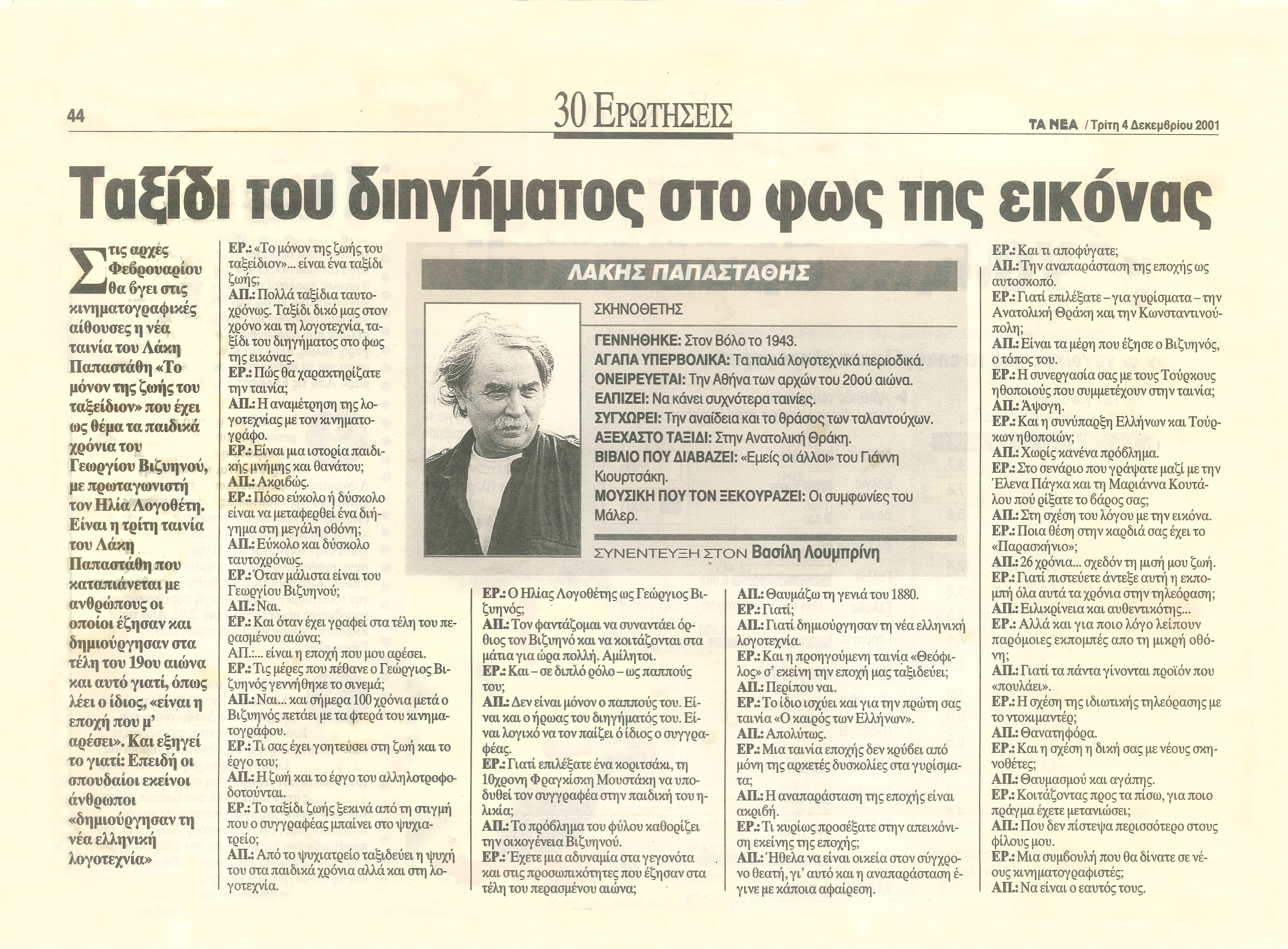 Συνέντευξη Λάκη στα "Νέα" 4 Δεκεμβρίου 2001