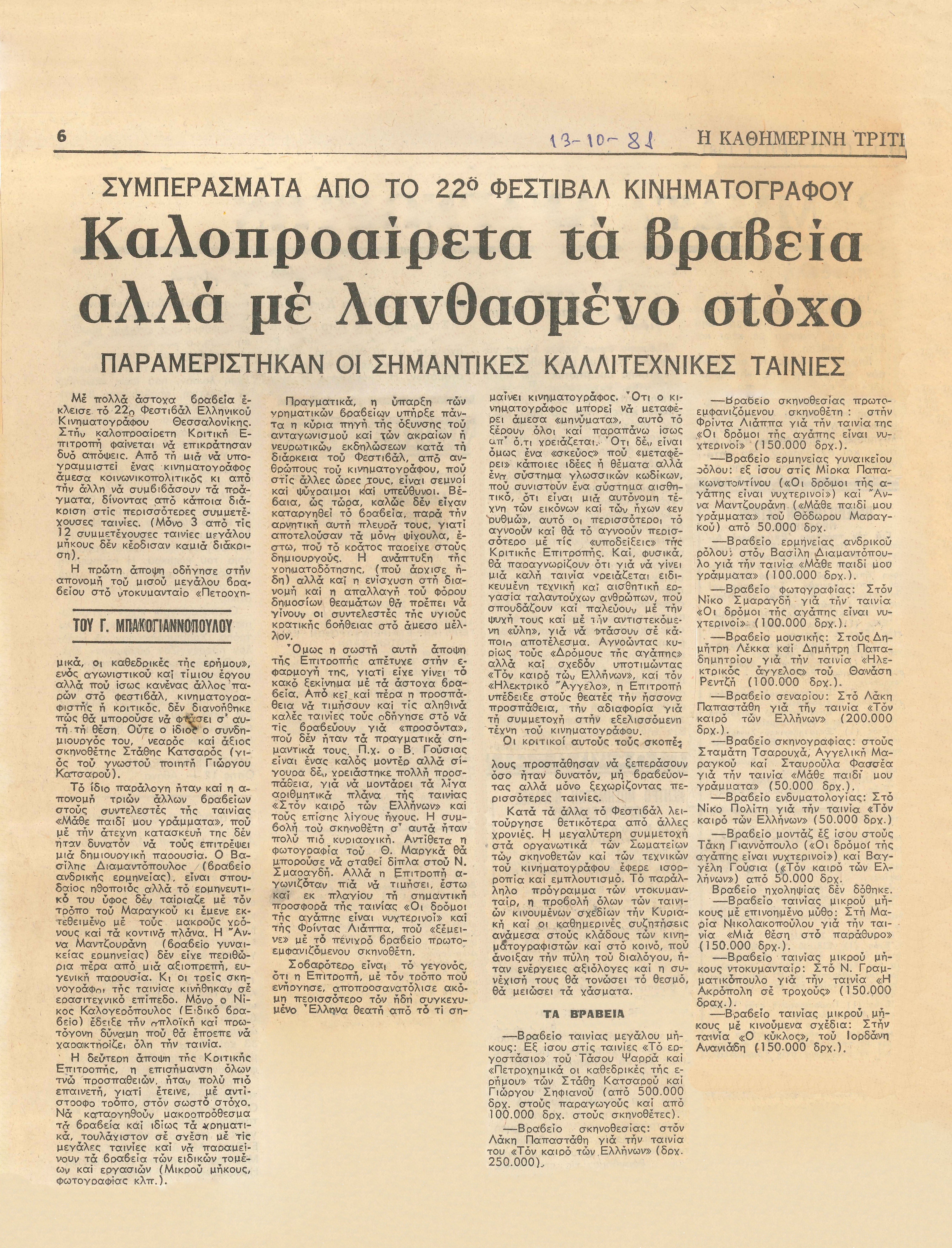 Βραβεία Φεστιβάλ Θεσσαλονίκης(Γιάννης Μπακογιαννόπουλος)