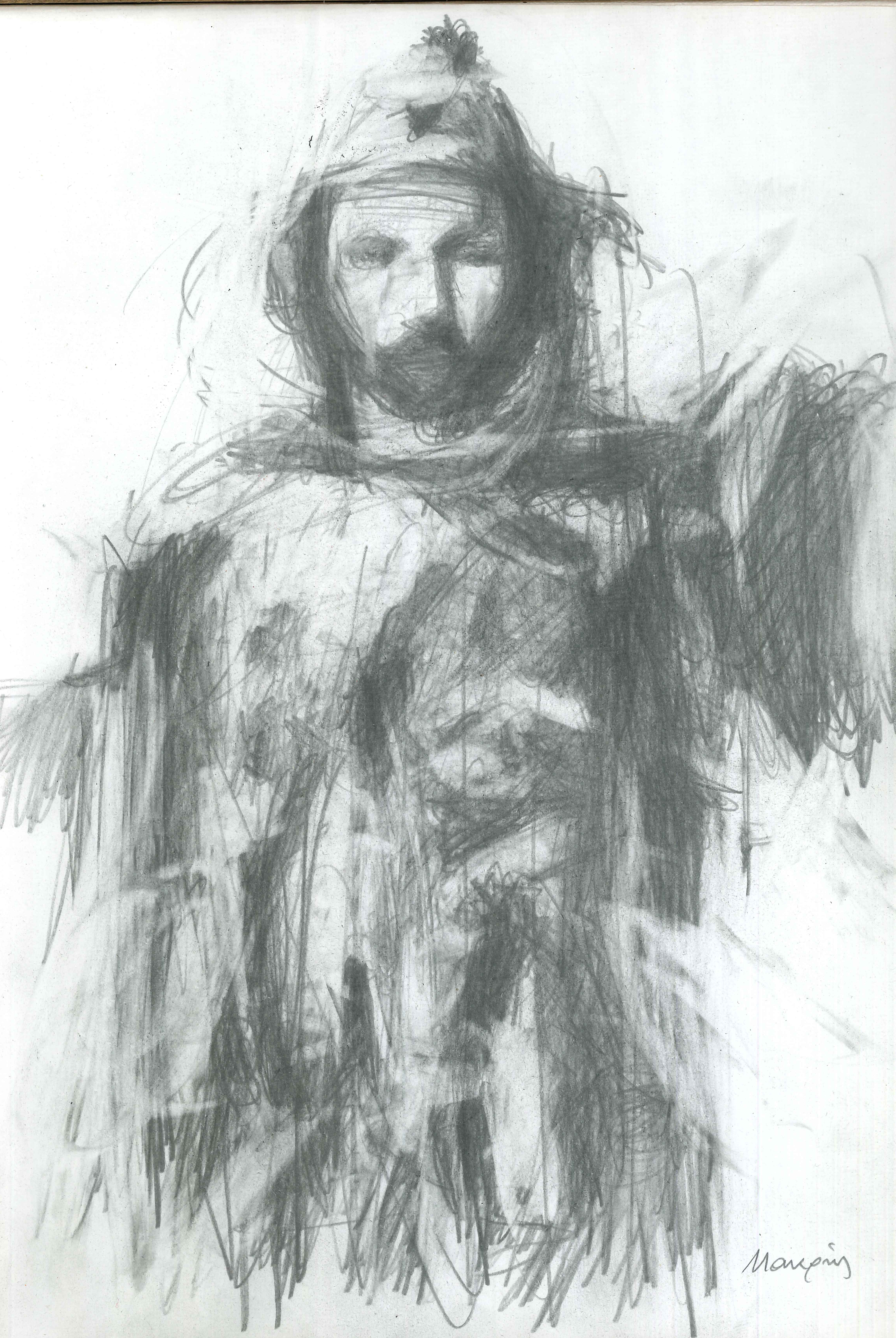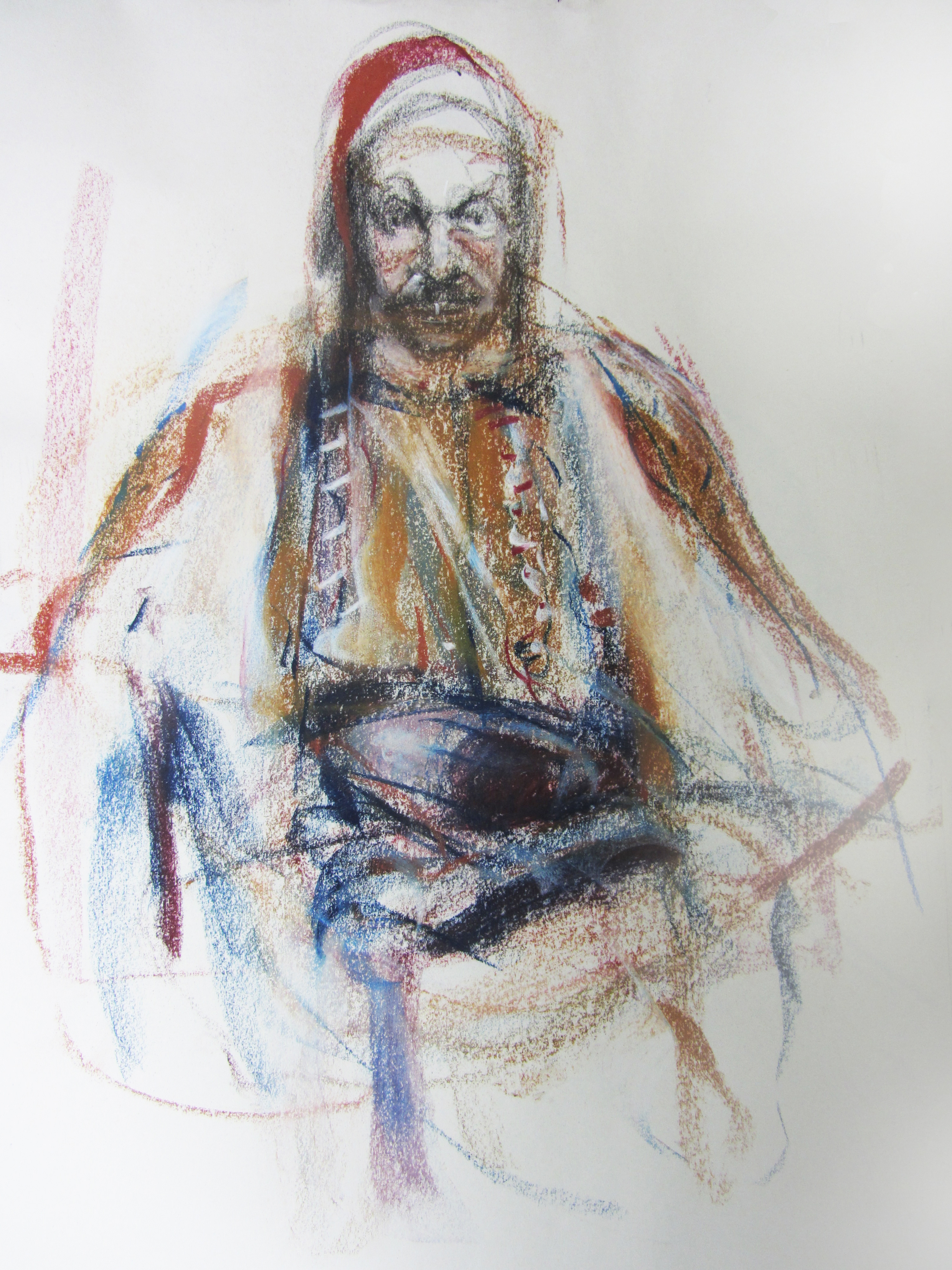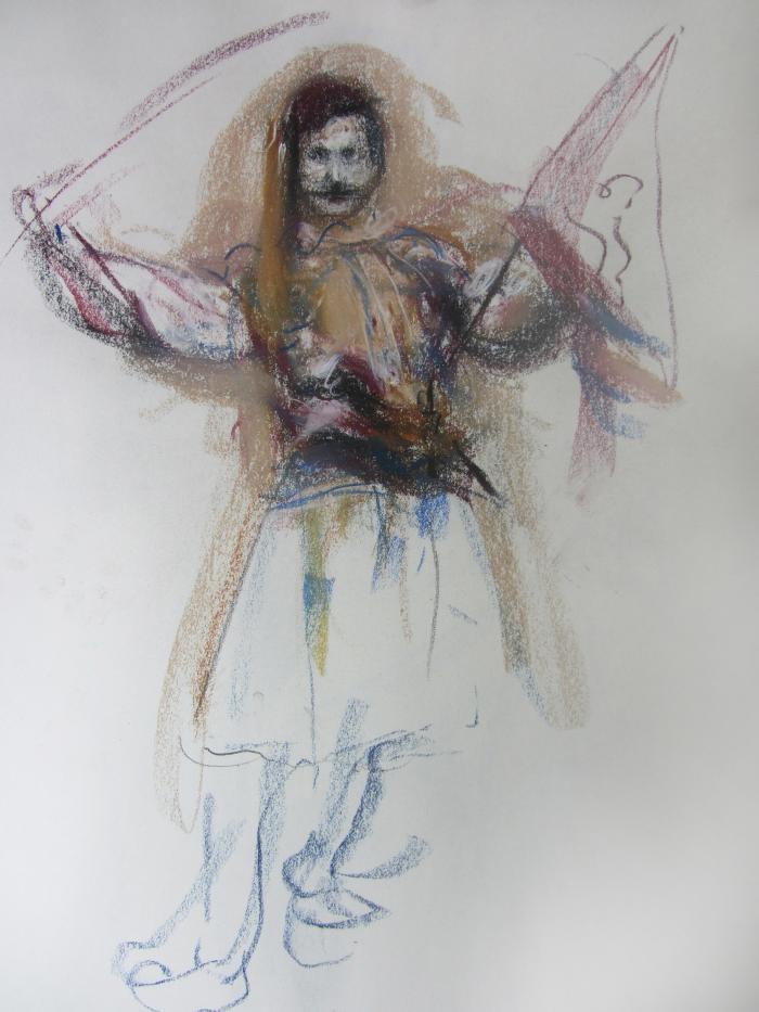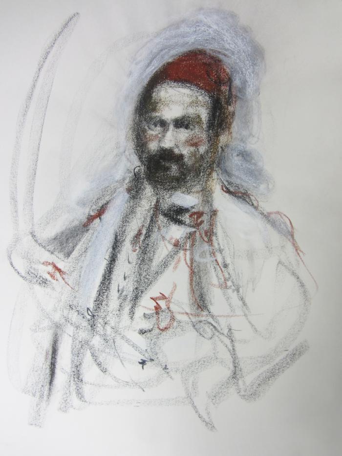 Ο Θεόφιλος με φουστανέλα και φέσι. παστέλ Θανάση Μακρή. Συλλογή του καλλιτέχνη.