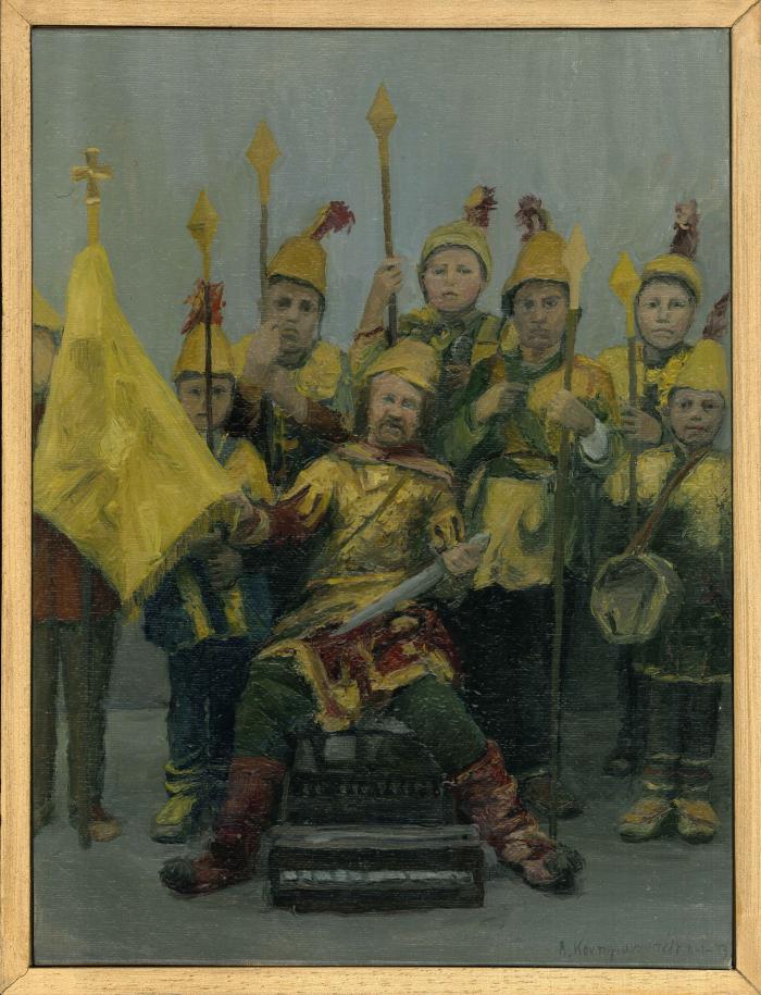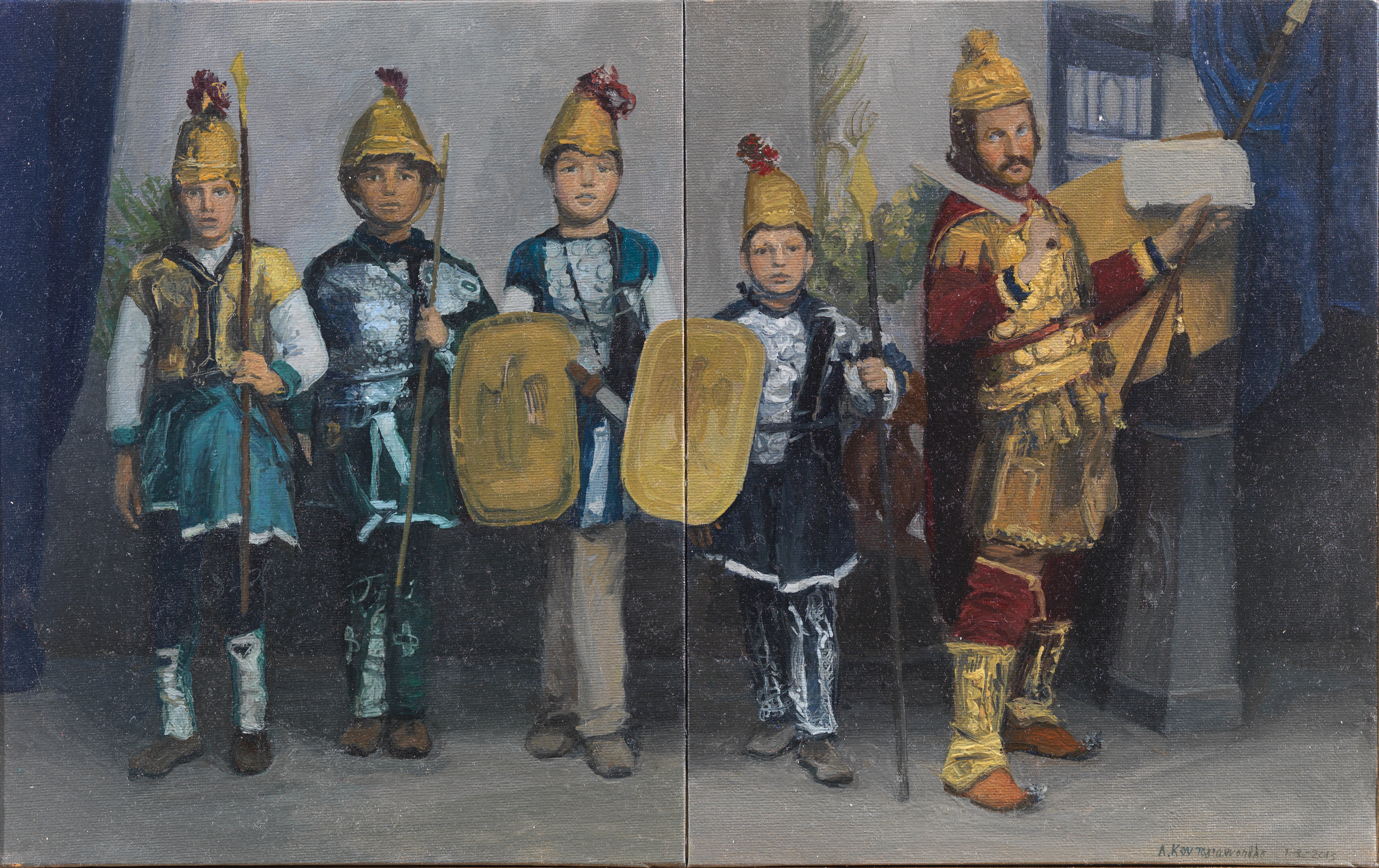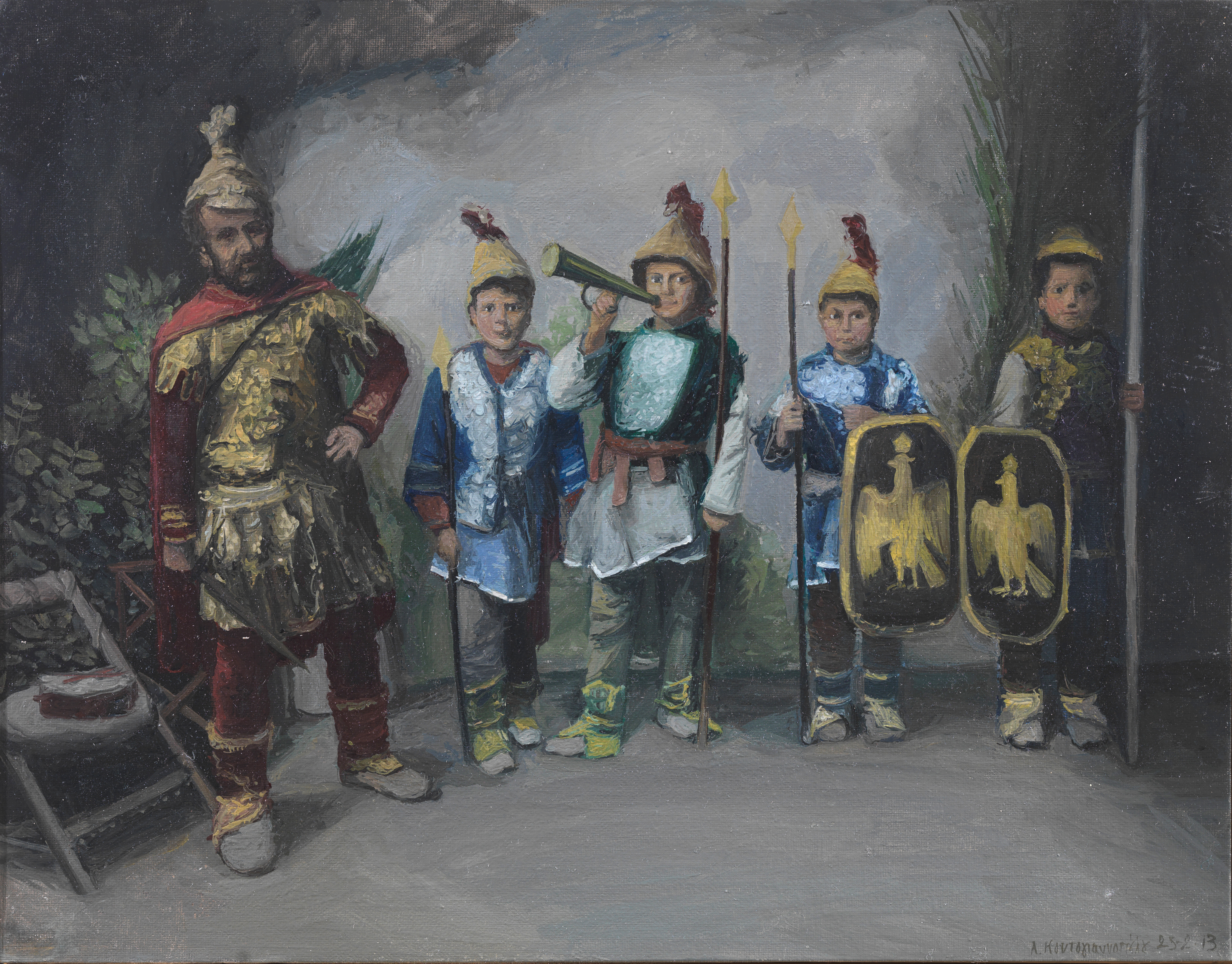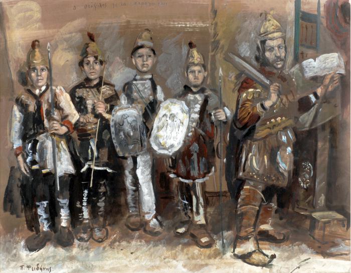 Ο Θεόφιλος ως Μέγας Αλέξανδρος και οι μικροί μακεδονομάχοι. Ζωγραφικη Παναγιώτης Φειδάκης. Ιδιωτική συλλογή.