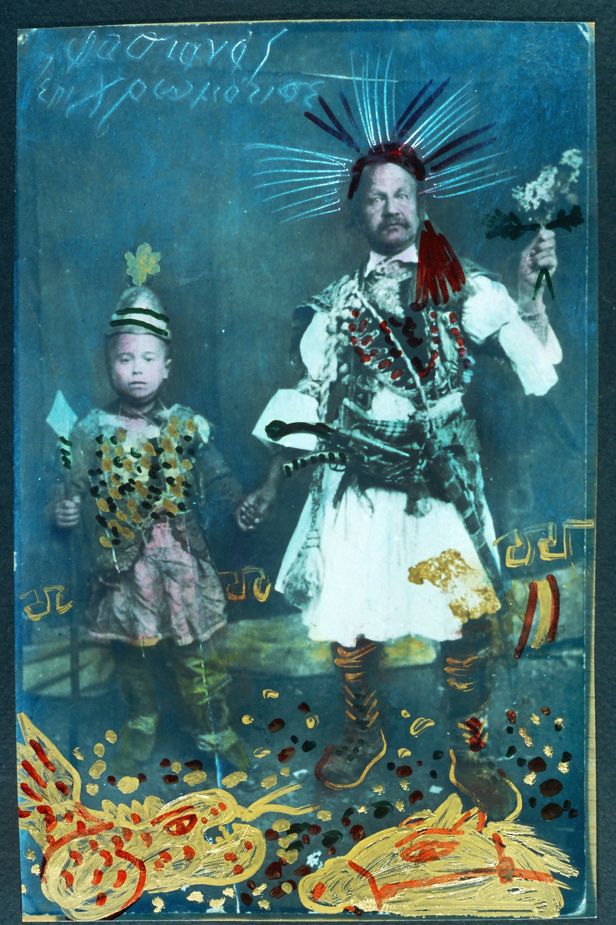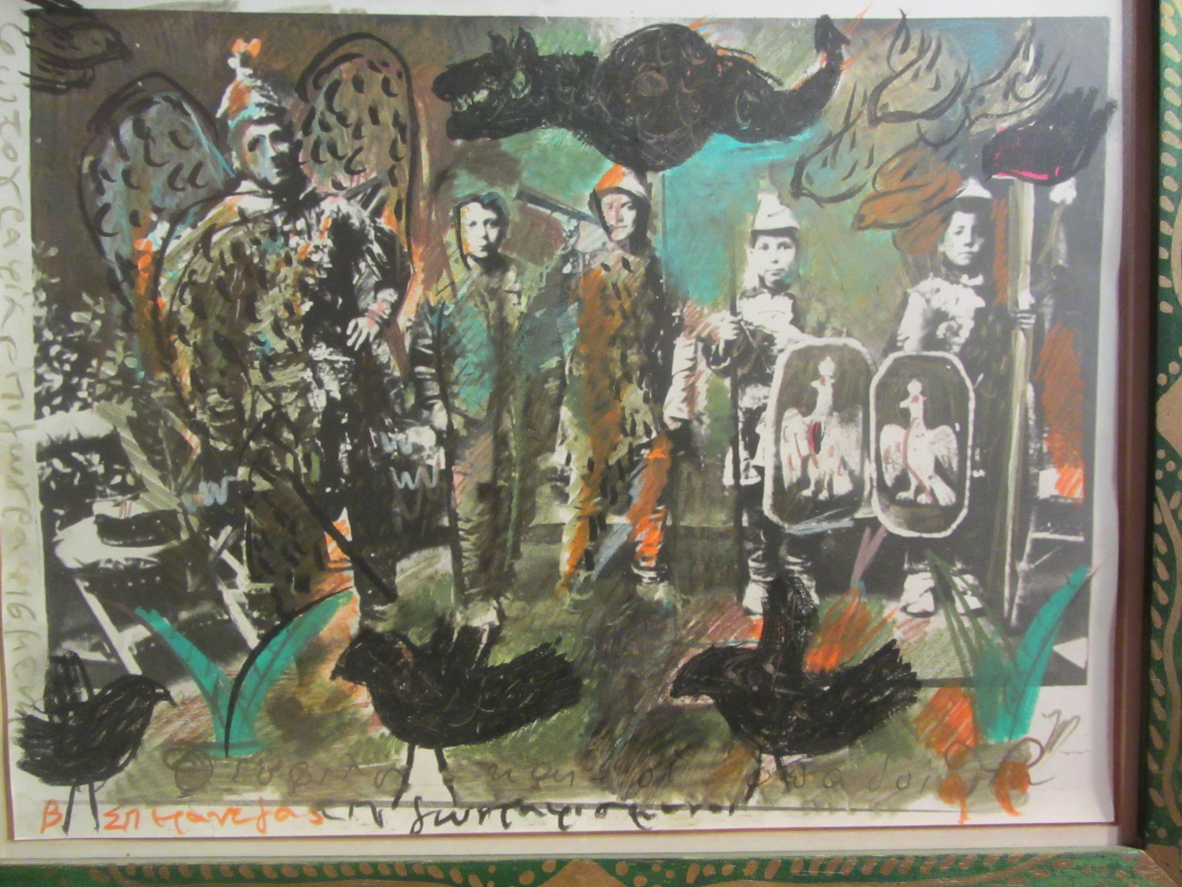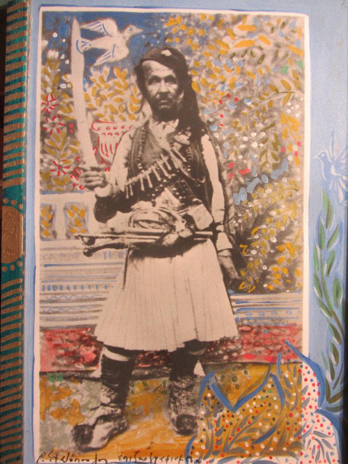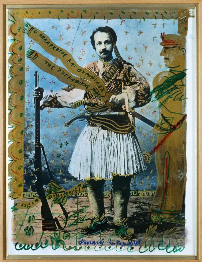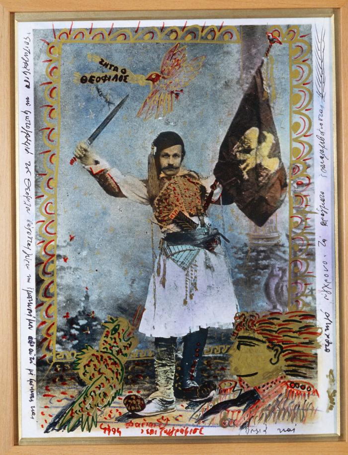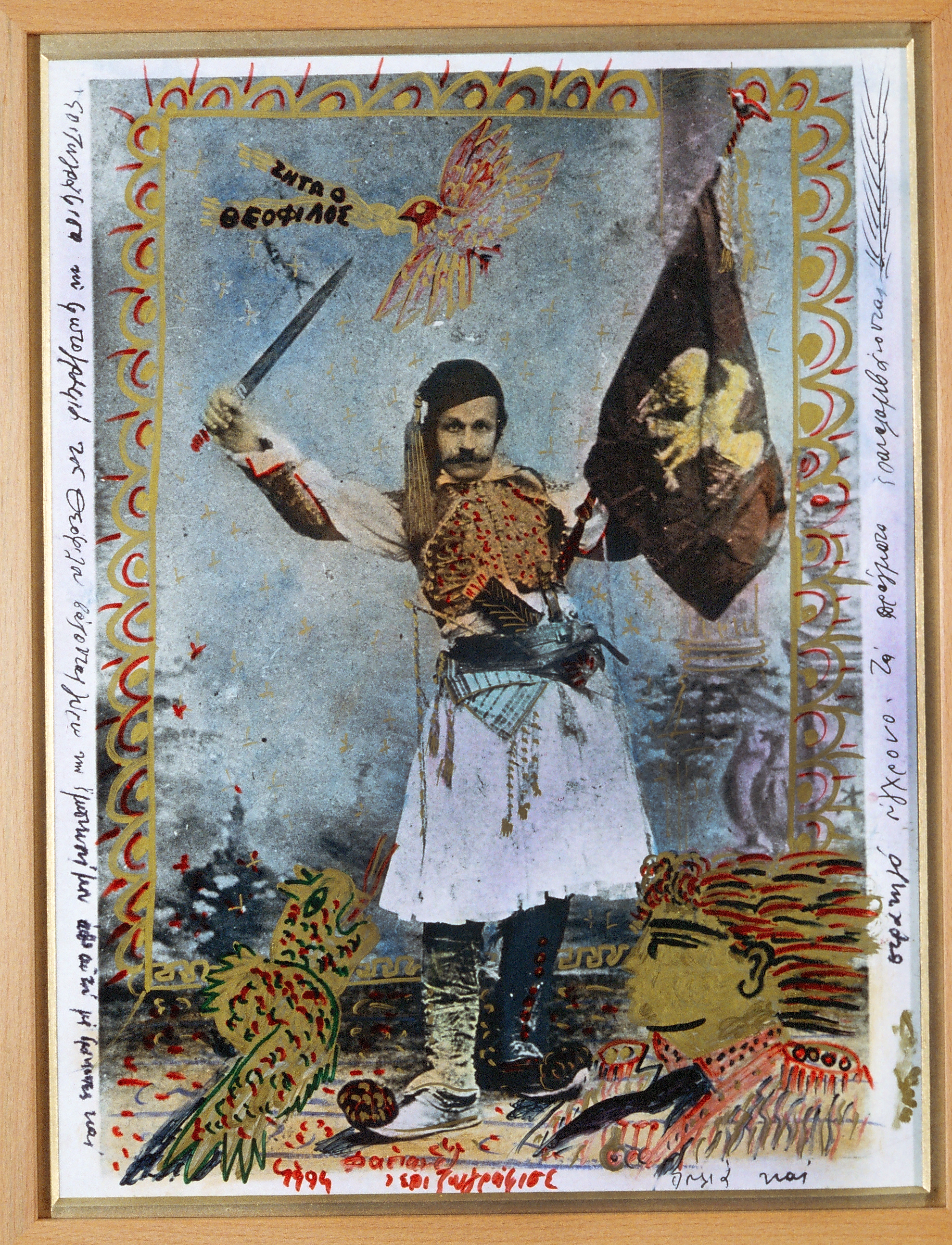 Ο Θεόφιλος με σημαία και σπαθί. «Επιζωγράφισα τη φωτογραφία του Θεόφιλου βάζοντας γύρω την έμπνευσή μου από αυτή με δράκοντες, πουλιά και στρατηγό σύγχρονο. Τα πράγματα επαναλαμβάνονται».