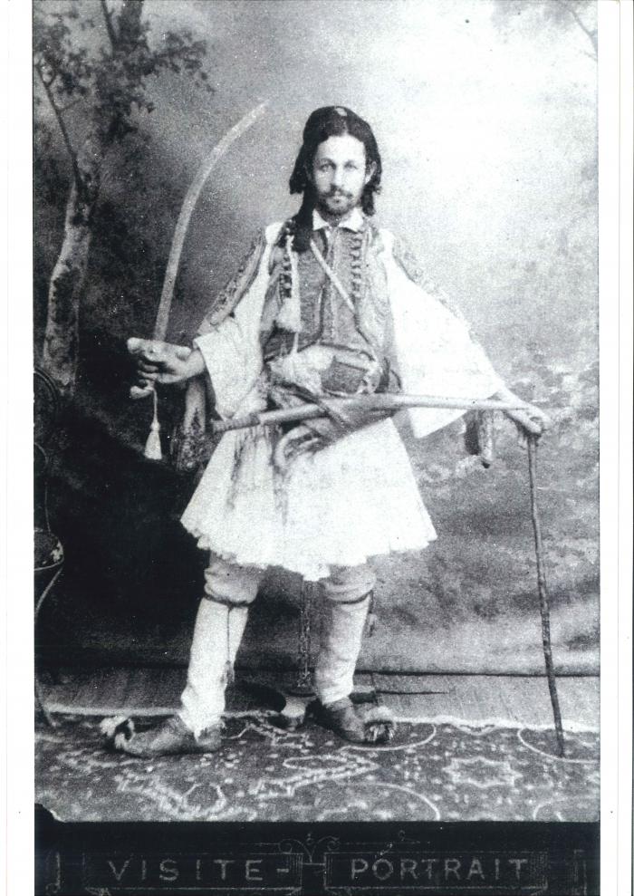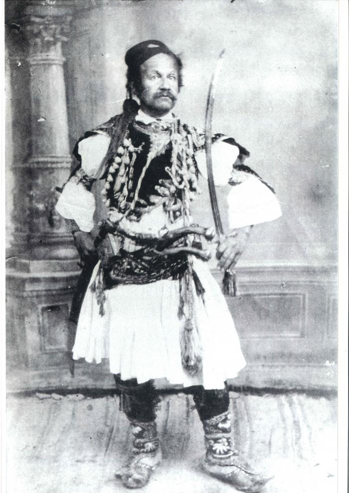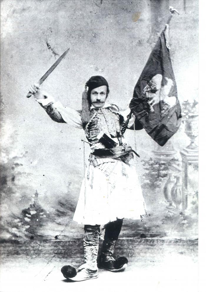 Ο Θεόφιλος μεσήλικας σε πόζα με σπαθί.