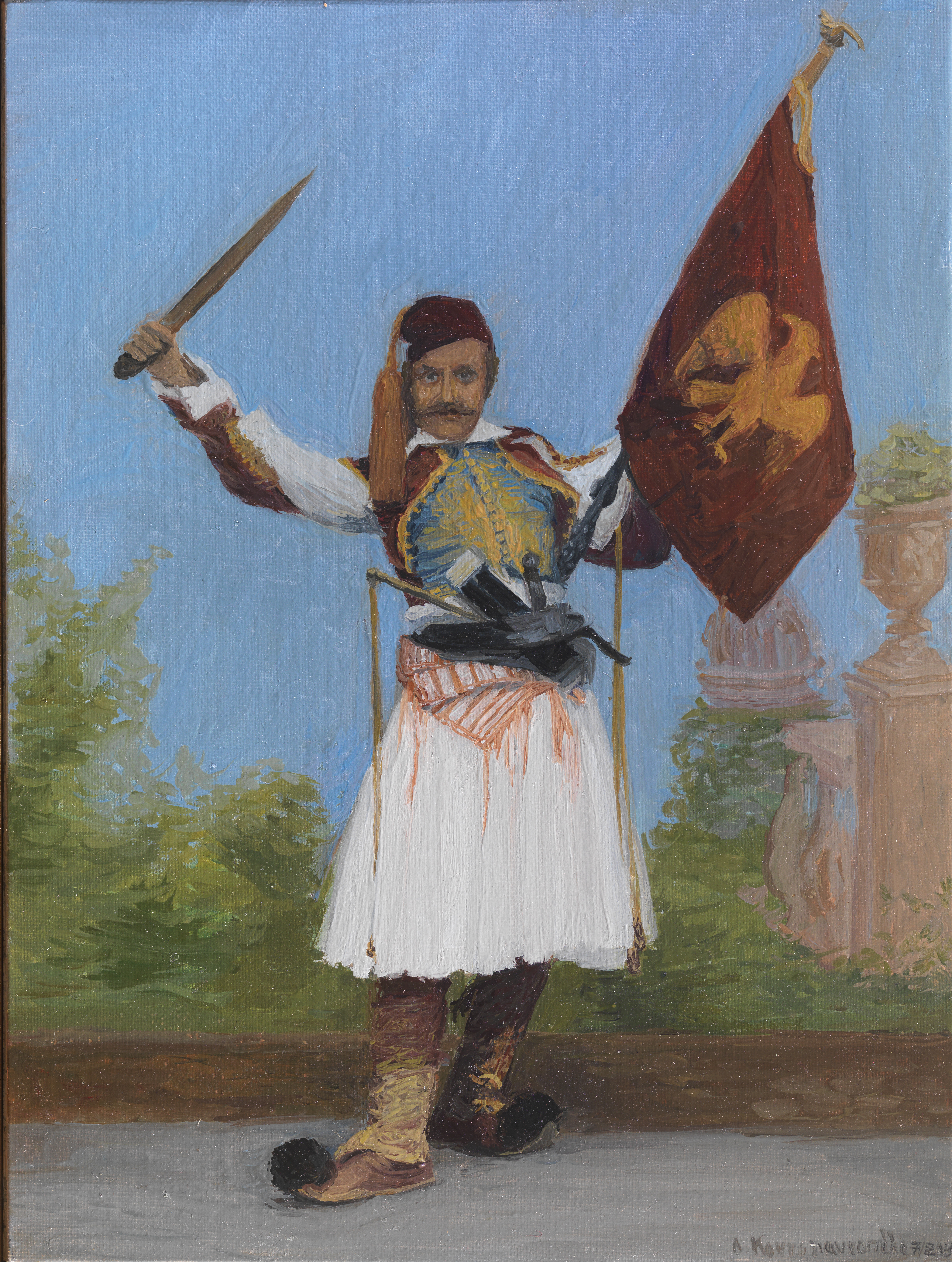Ο Θεόφιλος με σπαθί και σημαία. Ζωγραφική Λήδα Κοντογιαννοπούλου. Ιδιωτική συλλογή.