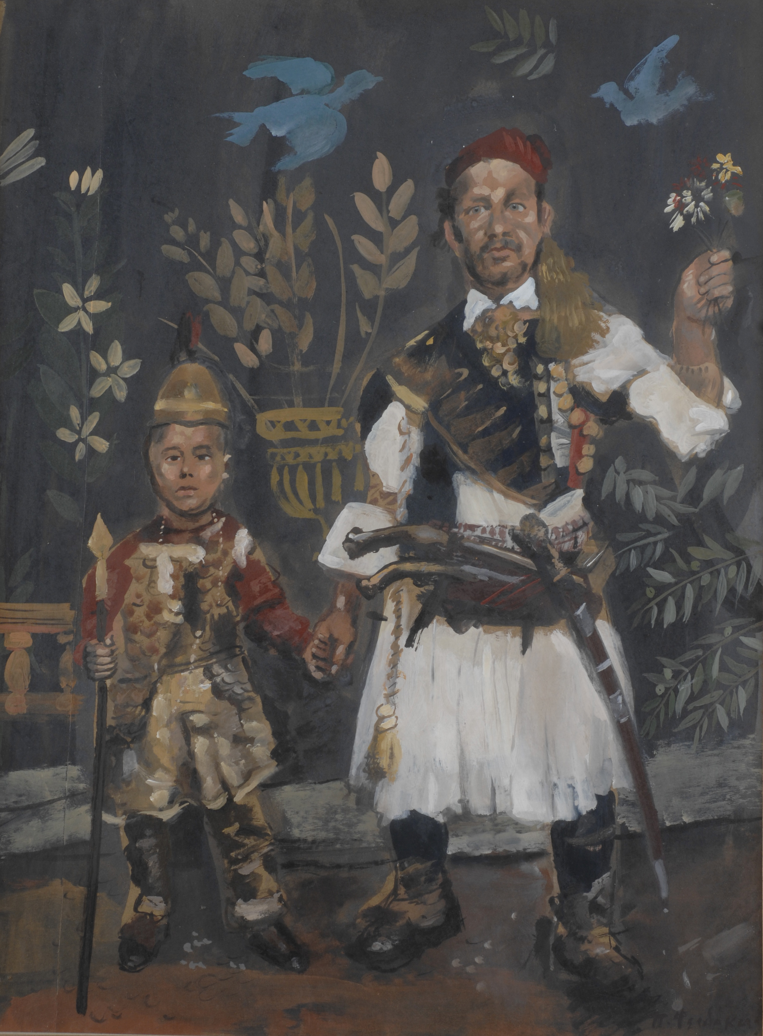 Ο Θεόφιλος με το παιδί. Ζωγραφική Παναγιώτης Φειδάκης.Ιδιωτική συλλογή.