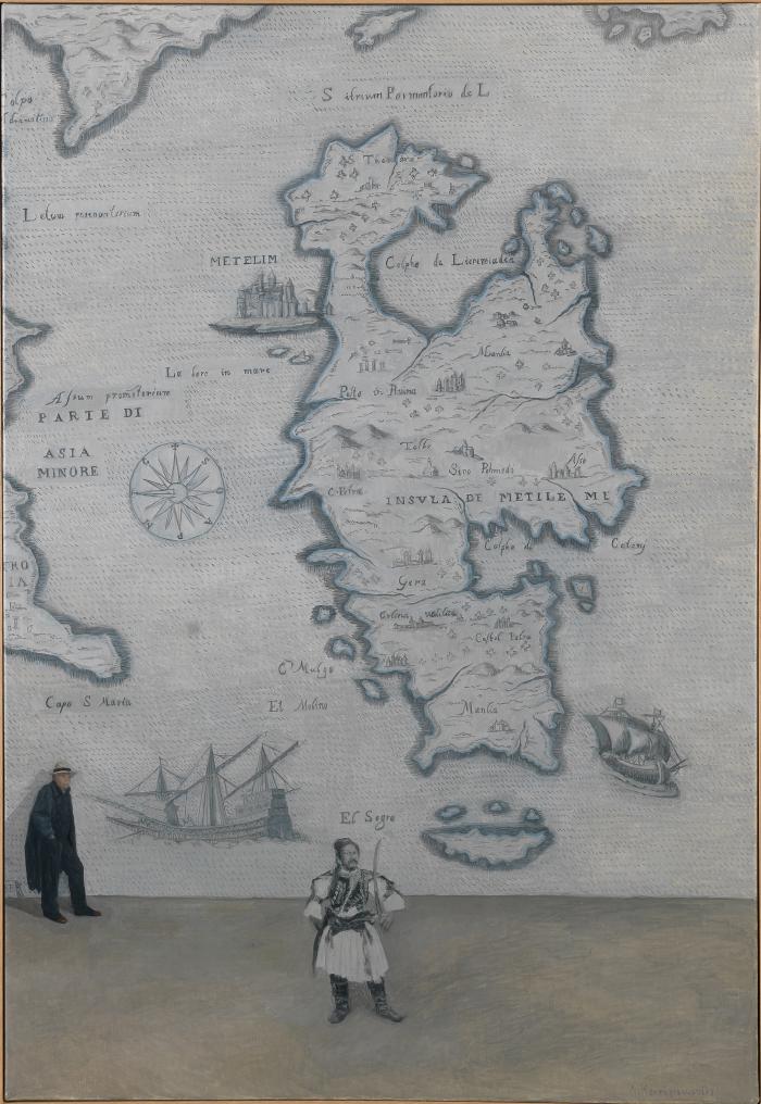Ο Λάκης παρατηρεί τον Θεόφιλο με φόντο παλιό χάρτη της Λέσβου. Έργο Λήδας Κοντογιαννοπούλου